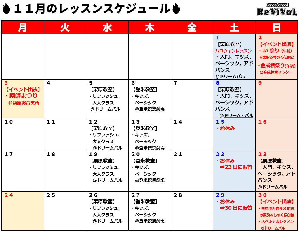 | クラス名 | 難易度 | 曜日 | 時間 | 場所 |